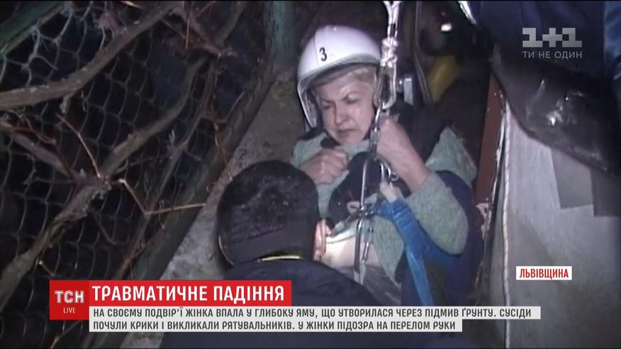 Сталося це на приватному подвір'ї жінки на Львівщині. Сорок хвилин вона кликала на допомогу. Врешті її почули сусіди і викликали рятувальників. Піднімали жінку дуже обережно. Внаслідок падіння вона отримала перелом руки.