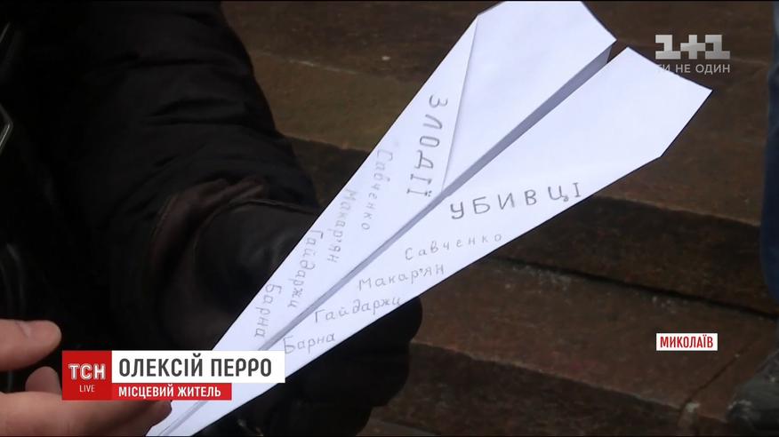 Відставки Олексія Савченка містяни вимагають після самогубства військового льотчика Владислава Волошина, який керував аеропортом. Перед смертю він скаржився і колегам, і товаришу про тиск на нього з боку чиновників обладміністрації. До активістів вийшов заступник губернатора, але люди з ним говорити не схотіли.
