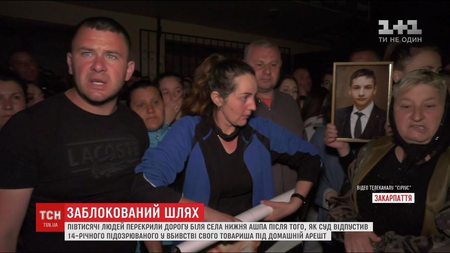 Півтисячі людей перекрили дорогу біля села Нижня Ашпа після того, як суд відпустив підозрюваного у вбивстві під домашній арешт, але люди побачили його за межею помешкання. Люди вимагали змінити запобіжний захід 14-річному хлопцю, якого підозрюють у вбивстві 15-річного товариша під час сварки.