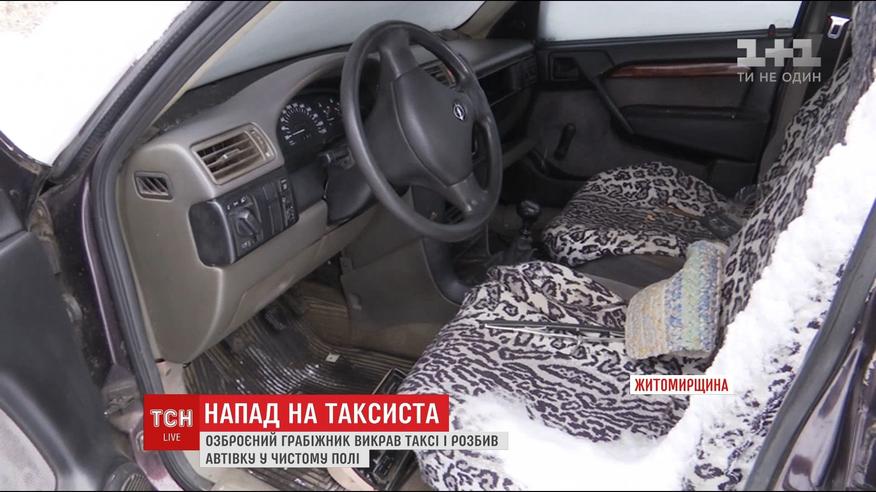 28-річний житомирянин викликав таксі до села, а дорогою змусив літнього водія зупинитися посеред поля. Погрожуючи ножем, відібрав автівку. Украдену автівку поліція знайшла на місцевій фермі. За скоєне йому загрожує до 12 років за гратами.