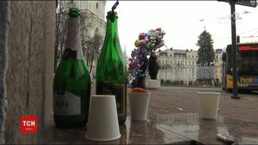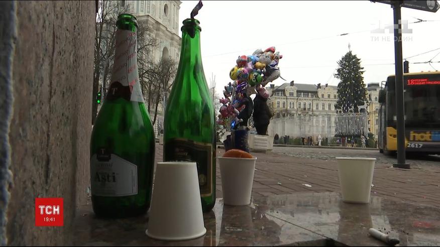 Тонни пляшок з під алкоголю комунальники вивезли після новорічної ночі тільки у столиці. Майже до обіду двірники розгрібали наслідки свята на Софійській площі.
