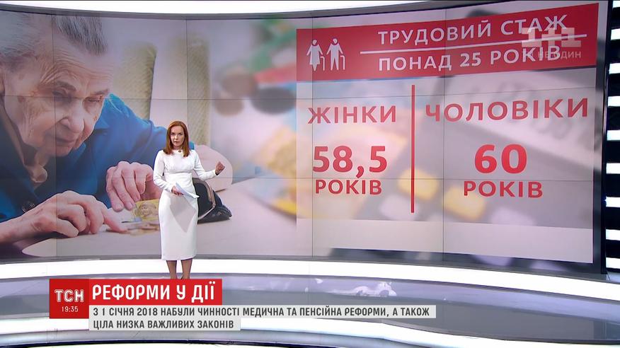 Відсьогодні запрацювали одразу декілька ухвалених наприкінці минулого року законів. Пенсійна реформа - мінімальний страховий стаж для потенційних пенсіонерів збільшується з 15 до 25 років і буде рости ще 10 років. Медична реформа стартувала, але запрацює навесні. Із квітня почне діяти система, яку у Міністерстві охорони здоров’я називають – "гроші ходять за пацієнтом".