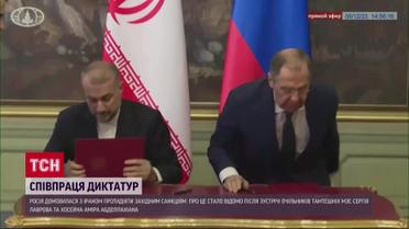 Вісь зла. Росія домовилася з Іраном протидіяти західним санкціям. Про це стало відомо після зустрічі очільників тамтешніх МЗС Сергія Лаврова та Хоссейна Аміра-Абдуллахіана. Економічні обмеження запроваджені Заходом через диктаторські режими в обох країнах, тож тепер вони підписали декларацію, аби разом пом'якшувати їх вплив. Ну а вже в четвер до Москви особисто прилетить президент Ірану Ібрагім Раїсі. Кремль почав зближуватися з Тегераном після початку повномасштабного вторгнення до України. Починаючи з 22-го року Іран передав армії агресора тисячі дронів камікадзе, якими нині стріляють по цивільних українцях та інфраструктурі, а також поділився технологією виробництва безпілотників. Деталі – в ТСН.
