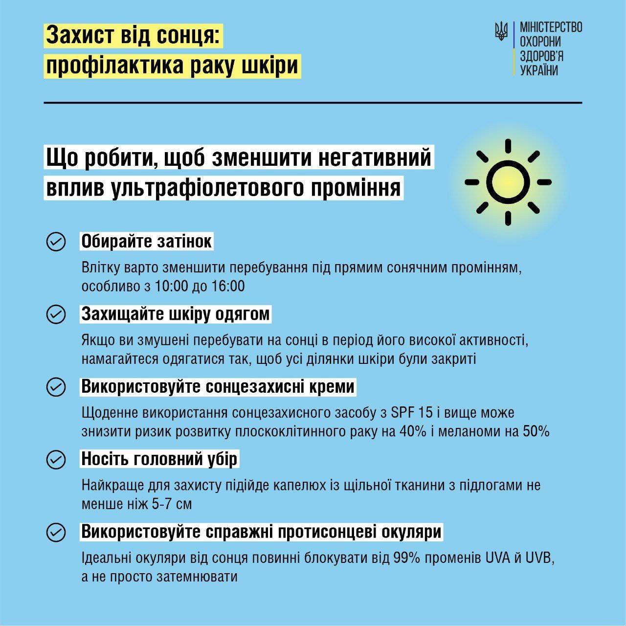 МОЗ публікує інформацію, що робити для профілактики раку шкіри.